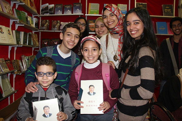 Na 47a edi??o da Feira Internacional do Livro do Cairo, os leitores egípicios mostram a vers?o em árabe e chinês do livro "A governan?a da China" de Xi Jinping. [Foto de Liu Shuiming, Diário do Povo].