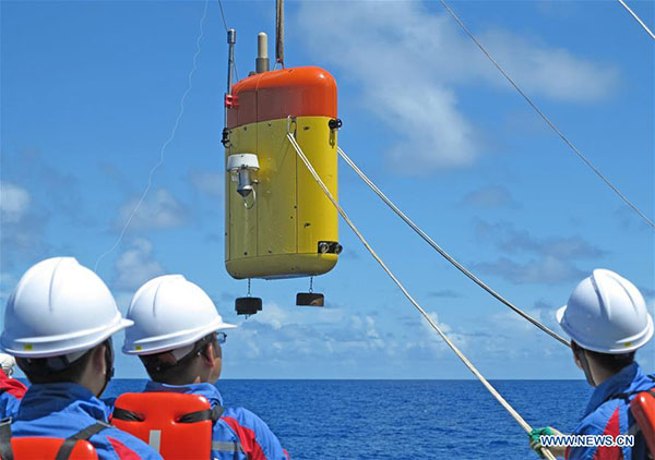 O submarino n?o tripulado da China “Haidou-1” prepara-se para submergir em águas perto da Fossa das Marianas no Pacífico Ocidental, o mar mais profundo do mundo, durante uma expedi??o científica no dia 1 de julho de 2016.