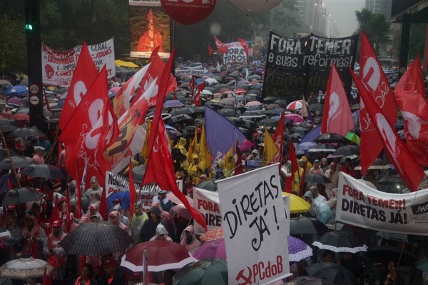 Em boa parte do país o domingo foi de muita chuva, mas as condi??es climáticas n?o impediram a popula??o de ocupar as ruas para exigir a renúncia do presidente golpista que agora é investigado por corrup??o, organiza??o criminosa e obstru??o à justi?a.