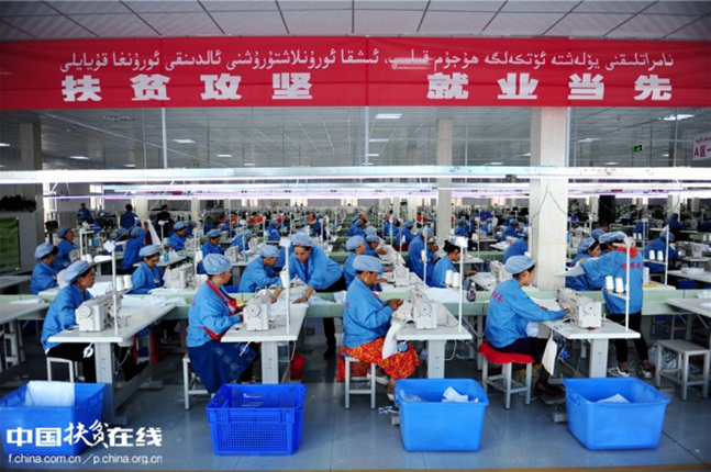 Funcionários das minorias étnicas trabalham na fábrica de vestuário Hengyao, no município de Kuqa, que emprega 600 residentes em pobreza e o excedente de m?o-de-obra rural.