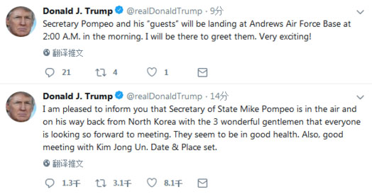 Três prisioneiros norte-americanos foram libertados pela República Popular Democrática da Coreia (RPDC) e regressaram aos EUA, juntamente com o secretário de Estado, Mike Pompeo, que acaba de regressar de uma visita oficial a Pyongyang.