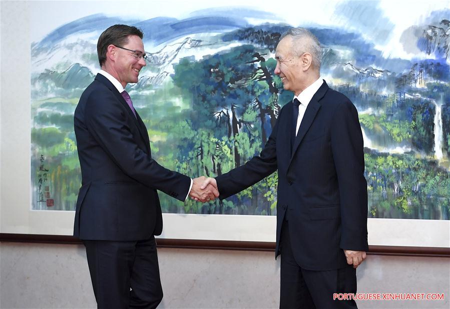 Beijing, 17 jul (Xinhua) -- O vice-primeiro-ministro chinês, Liu He, reuniu-se nesta segunda-feira em Beijing com o vice-presidente da Comiss?o Europeia, Jyrki Katainen, e prometeu colaborar com a Uni?o Europeia (UE) para salvaguardar com firmeza as regras do livre comércio e o comércio multilateral.