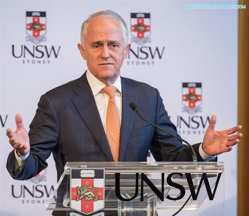 O primeiro-ministro australiano, Malcolm Turnbull, fala na Universidade de Nova Gales do Sul (UNSW, na sigla em inglês) em Sydney, Austrália, em 7 de agosto de 2018. O primeiro-ministro australiano, Malcolm Turnbull, destacou a for?a das rela??es Austrália-China na ter?a-feira, falando sobre a importancia da colabora??o nas áreas de educa??o e inova??o. (Xinhua/Zhu Hongye)