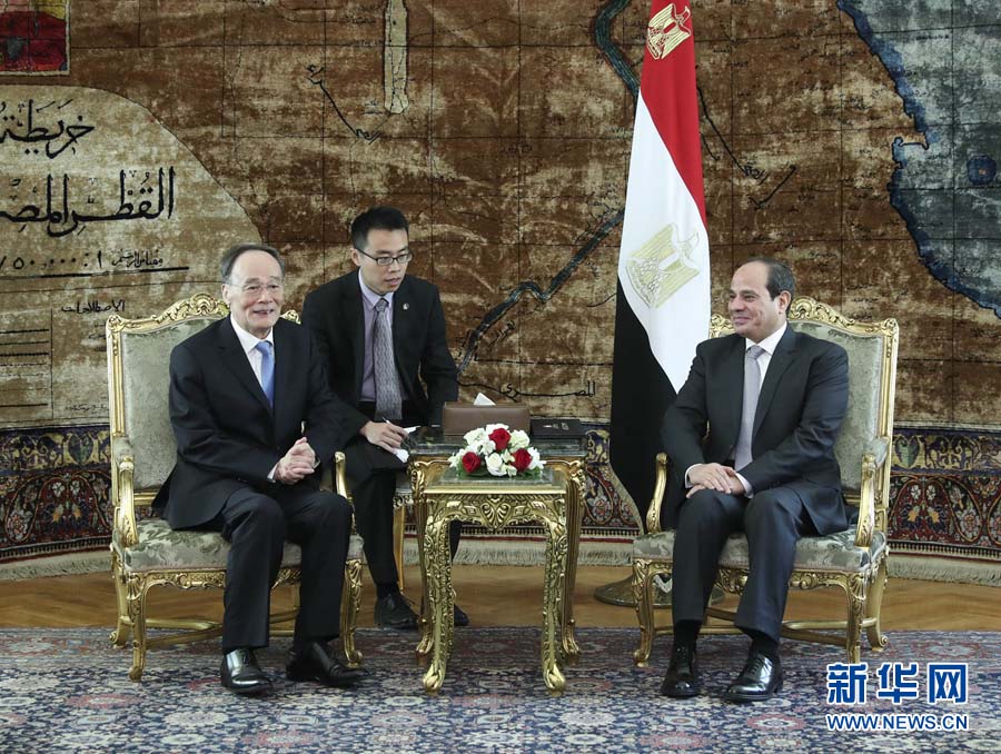 Em reuni?o com o presidente egípcio, Wang disse que as duas civiliza??es antigas compartilham interesses amplos e um grande potencial de coopera??o. A China está disposta a fortalecer o entendimento mútuo, coordenar as estratégias de desenvolvimento e fortalecer a coopera??o em economia, comércio, capacidade de produ??o e intercambios culturais sob a Iniciativa do Cintur?o e Rota.