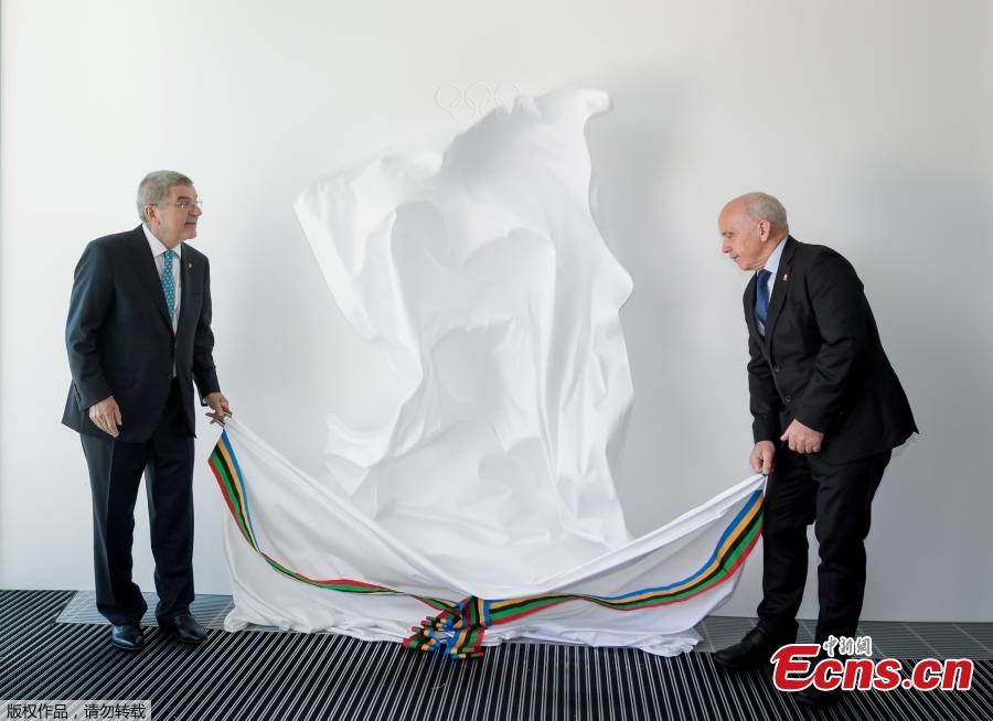 Thomas Bach, presidente do Comité Olímpico Internacional (COI) e Ueli Maurer, presidente da Suí?a revelaram uma placa inaugural durante a inaugura??o da sede nova do COI em Lausanne, Suí?a, a 23 de junho de 2019.
