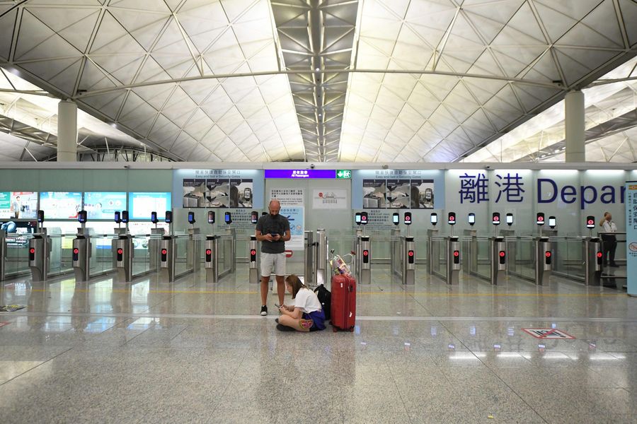 Turistas ficam retidos depois que os voos s?o cancelados devido ao caos causado por manifestantes no Aeroporto Internacional de Hong Kong, em Hong Kong, no sul da China, em 12 de agosto de 2019. (Xinhua)
