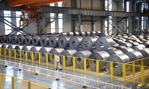 Um trabalhador da HBIS Group Tangsteel Company patrulha na área de armazenamento de bobinas de a?o em Tangshan, na província de Hebei, norte da China, 31 de maio, 2019. (Xinhua/Mu Yu)