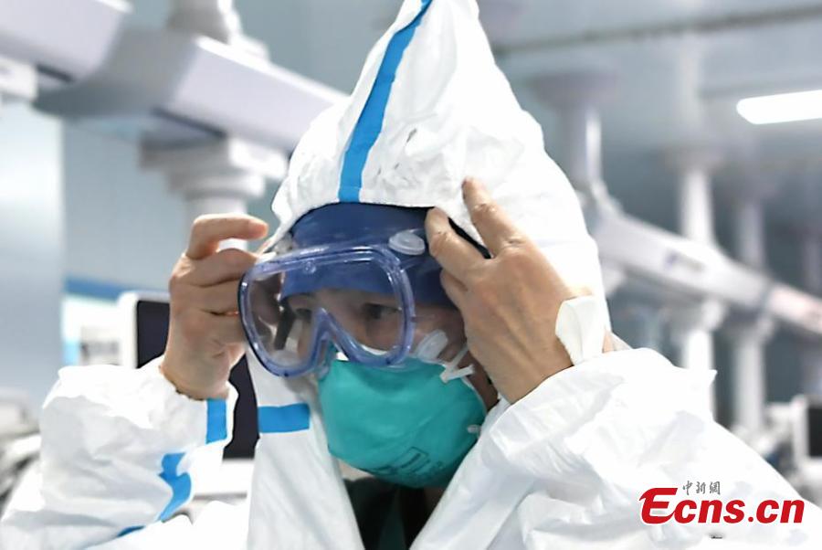 Li Lanjuan usa óculos de prote??o antes de entrar na UTI no hospital.