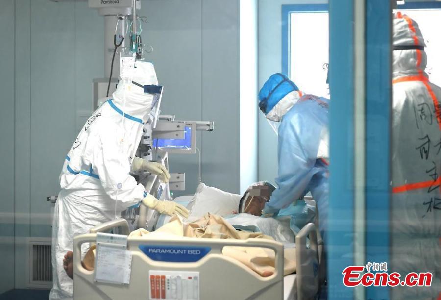 A epidemiologista Li Lanjuan (E), com 73 anos de idade, também membro da equipe de especialistas de alto nível convocada pela Comiss?o Nacional de Saúde, verifica a condi??o de um paciente infectado por coronavírus na unidade de terapia intensiva (UTI) do Hospital Renmin da Universidade de Wuhan, na província de Hubei, no centro da China, a 20 de fevereiro de 2020.