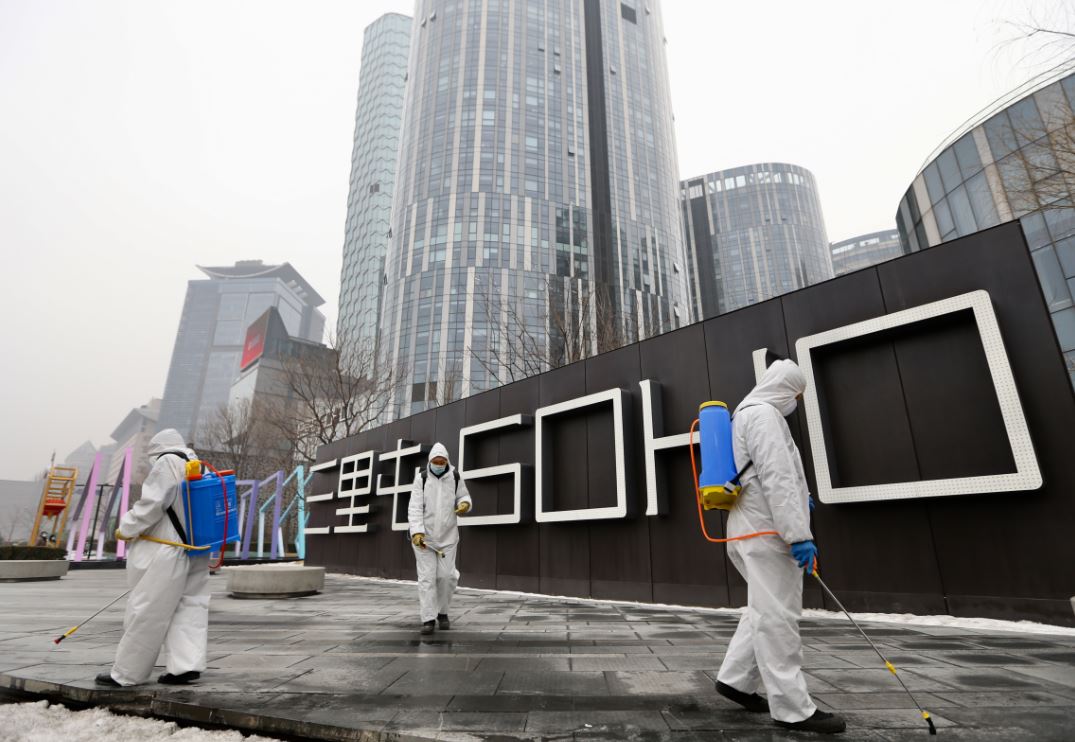 Equipe de funcionários desinfeta o prédio no Sanlitun SOHO em Beijing, em 13 de fevereiro, 2020. (Zhang Wei/Para China Daily)