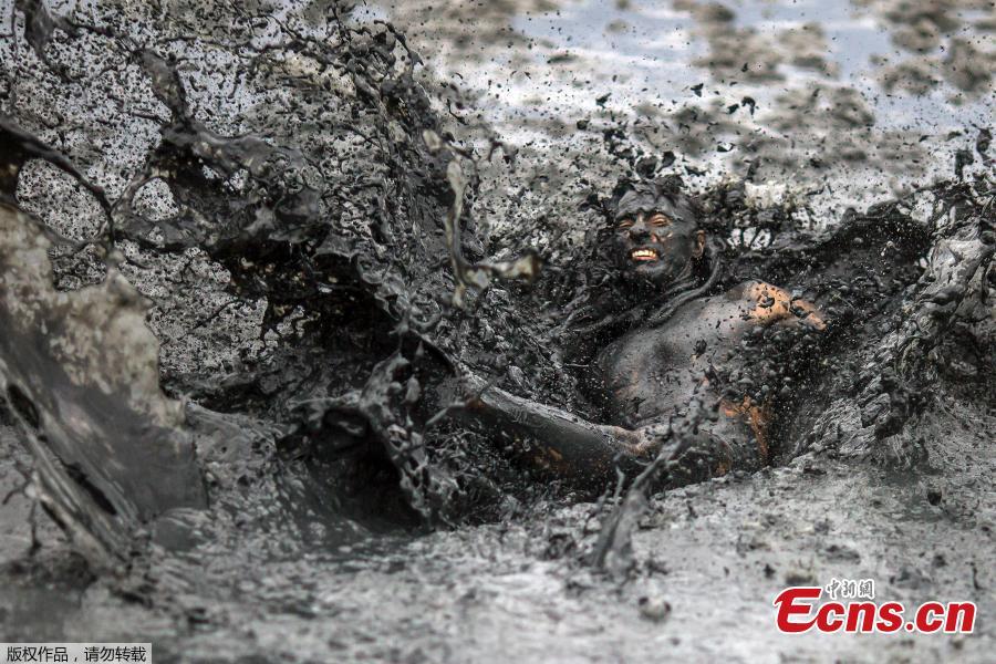 Um foli?o pula na lama durante o "Bloco da Lama", uma das tradi??es do carnaval, em Paraty, no Estado do Rio de Janeiro, Brasil, em 22 de fevereiro de 2020.
