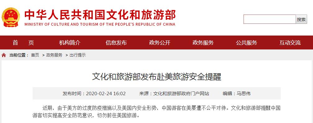 O ministério de Cultura e Turismo da China publicou ontem (24) um comunicado de alerta sobre a seguran?a nas desloca??es aos Estados Unidos, dado que aquele país tem implementado medidas excessivas sobre o controle da epidemia, resultando em um tratamento desigual aos viajantes chineses. O ministério instou os viajantes chineses a suspenderem suas viagens aos EUA e a tomarem as devidas precau??es durante a estadia no país.