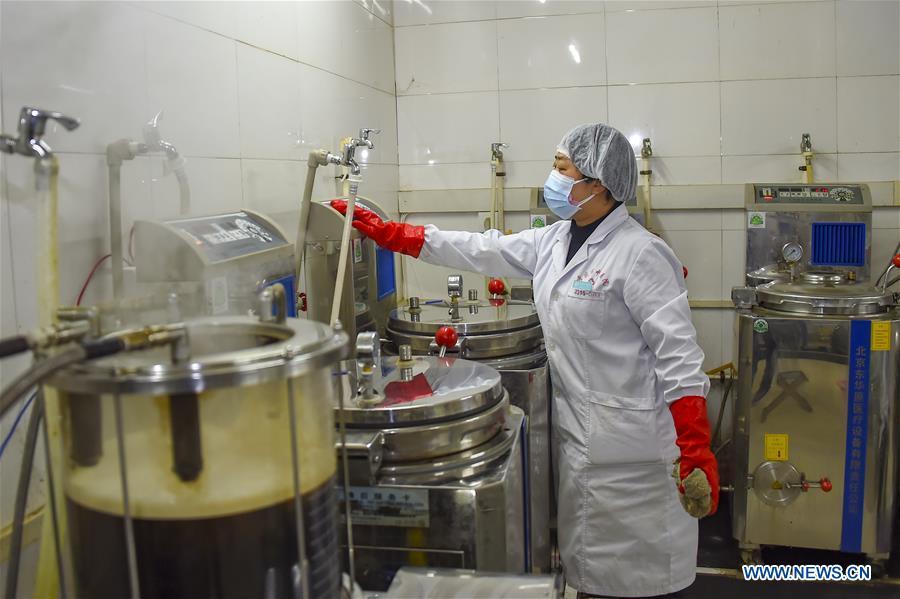 Yan Liqiong, uma farmacêutica da medicina tradicional chinesa (MTC), produz doses da MTC para ajudar a combater a epidemia do novo coronavírus no Hospital de Medicina Tradicional Chinesa da cidade de Xiaogan, na província de Hubei, no centro da China, a 25 de fevereiro de 2020.