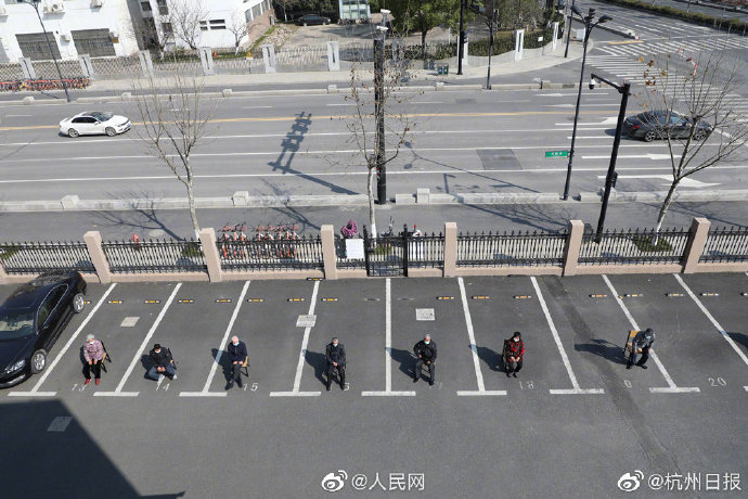 Recentemente, uma foto de um grupo de idosos da comunidade Caima, Hangzhou, tomando banhos de sol, foi republicada no Wechat. Cada um deles, envergando uma máscara, ocupou uma vaga de estacionamento automóvel.