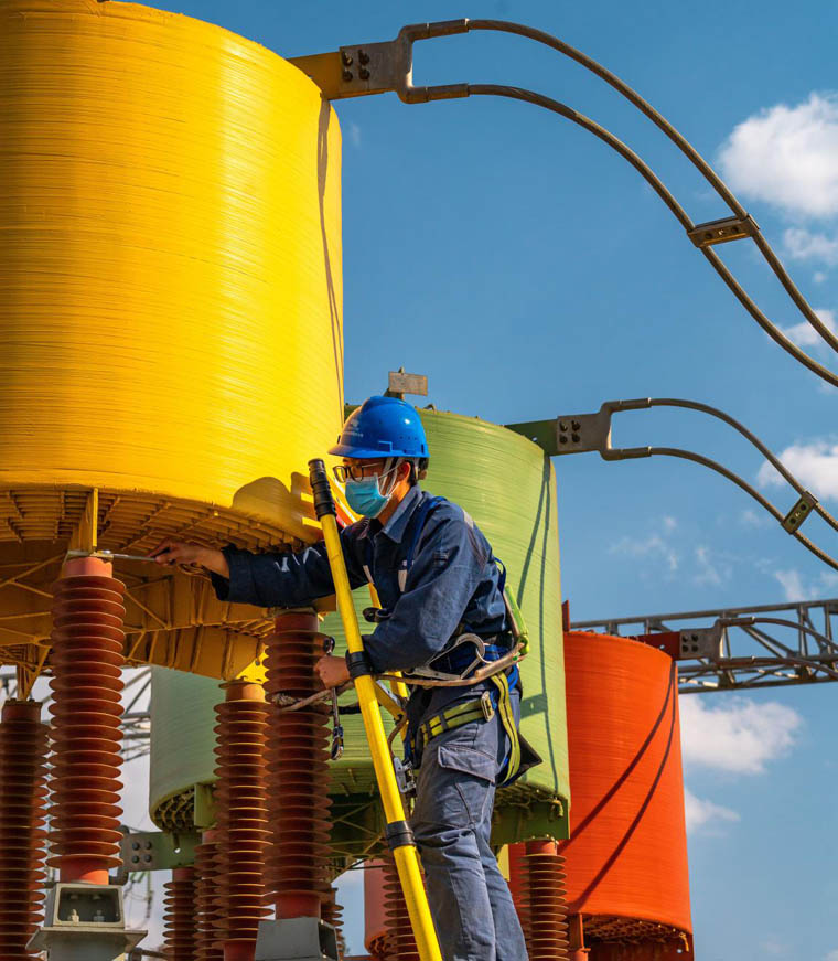 Um eletricista repara um equipamento na subesta??o Longhai, parte da esta??o elétrica Wudongde, localizada na fronteira entre as províncias de Sichuan e Yunnan, no dia 24 de fevereiro. (Ye Chuanzeng, Zhao Yangyang/Diário do Povo)