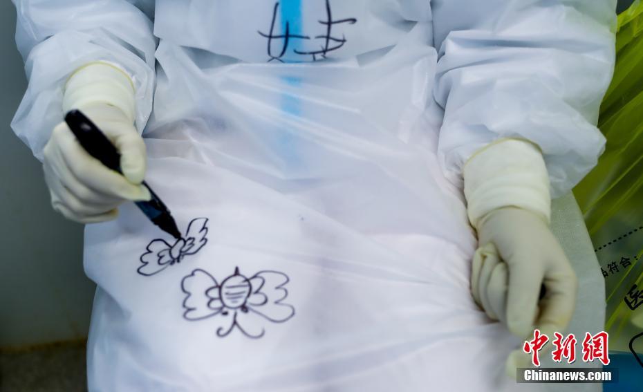 Um trabalhador médico pinta sua roupa de prote??o durante o intervalo.