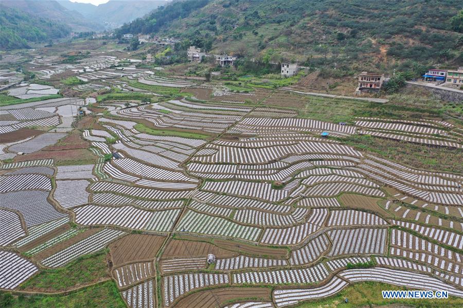 A foto aérea tirada em 3 de mar?o de 2020 mostra uma base de planta??o vegetal na vila de Duanqiao, no condado aut?nomo Bouyei-Miao de Guanling, na província de Guizhou, no sudoeste da China.