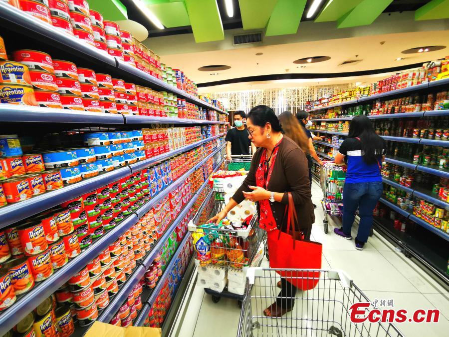 Uma mulher coloca comida enlatada no carrinho de compras em um supermercado.