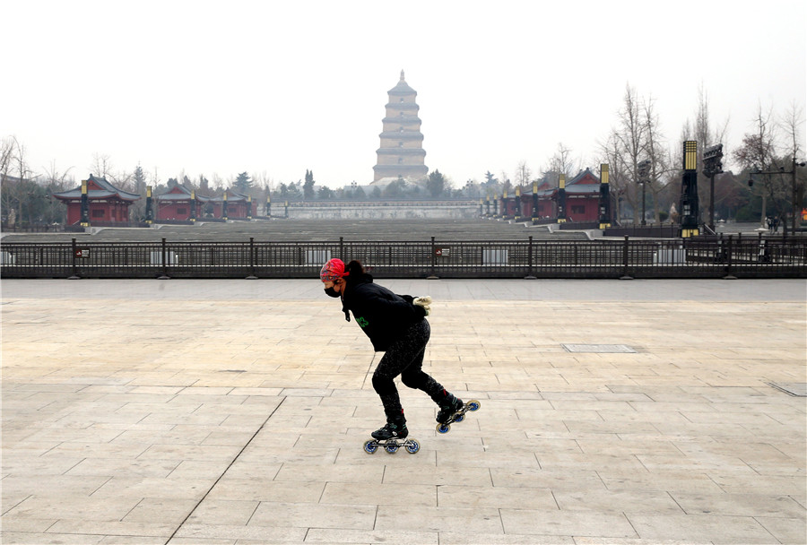Patinadora se exercita na pra?a em frente ao Pagode do Grande Ganso Selvagem.