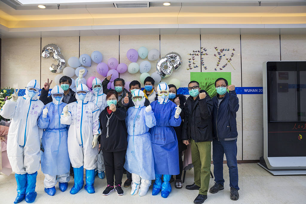 último lote de pacientes que receberam alta e a equipe médica tiram uma foto no hospital antes da suspens?o.