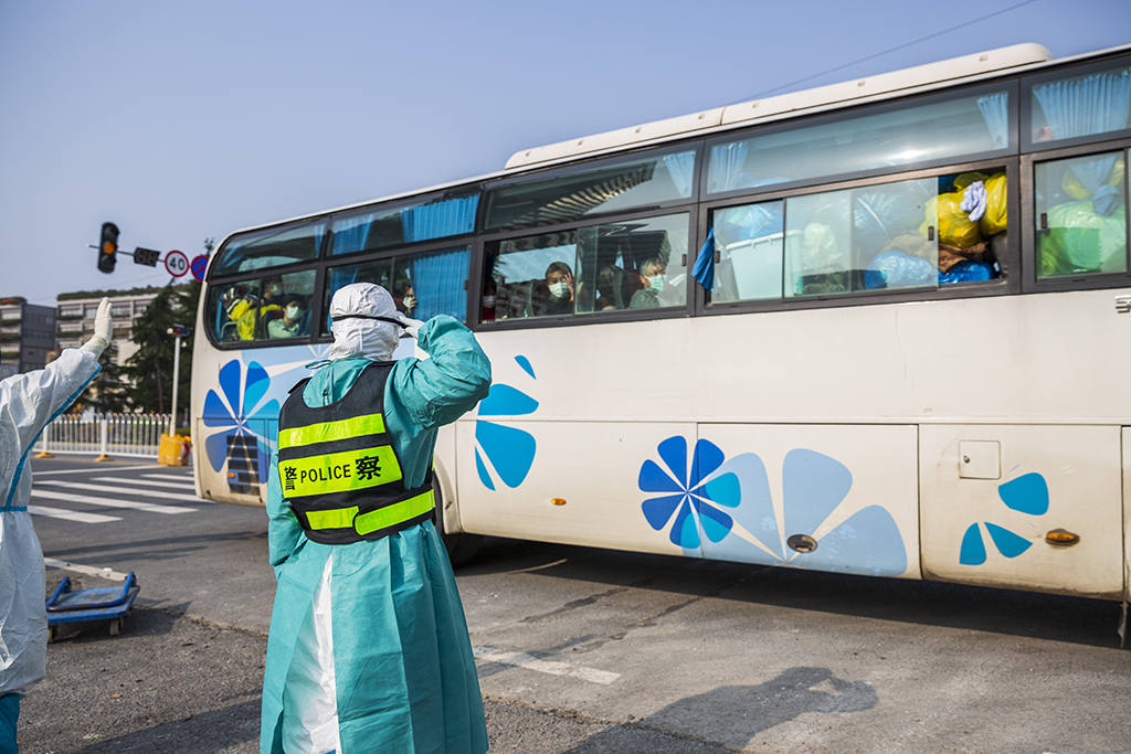 A equipe médica e a polícia despedem-se dos últimos pacientes transferidos.