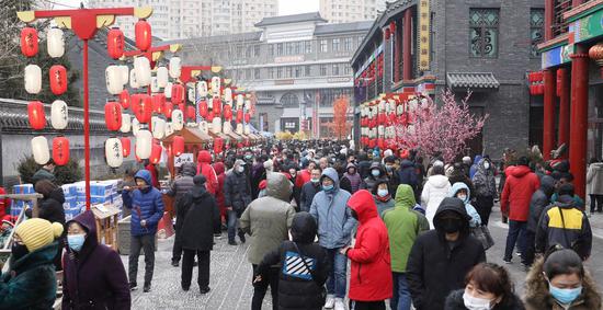 As pessoas visitam o Antigo Mercado do Norte durante o feriado do Ano Novo Lunar em Shenyang, província de Liaoning no nordeste da China, em 14 de fevereiro de 2021. (Xinhua / Yang Qing)