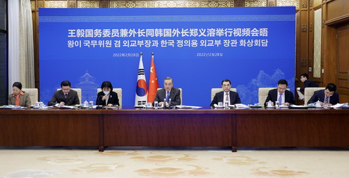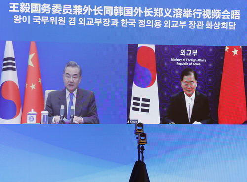 O conselheiro de Estado e ministro das Rela??es Exteriores da China, Wang Yi, realizou nesta segunda-feira uma videoconferência com o ministro das Rela??es Exteriores da República da Coreia, Chung Eui-yong.