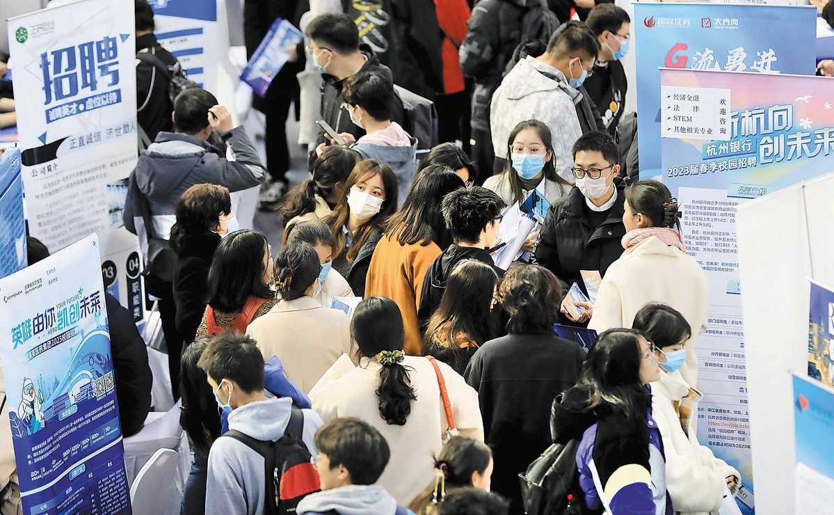 Estudantes procuram emprego em uma feira de empregabilidade na Universidade do Sudoeste, em Nanjing, província de Jiangsu, em 16 de abril. Foto: Liu Li, China Daily