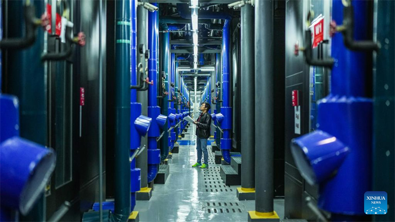 Um membro da equipe inspeciona o estado operacional da sala de micromódulos no Centro de Dados de Guian da China Unicom, na Nova área Guian, província de Guizhou, sudoeste da China, em 23 de maio de 2023. (Xinhua/Tao Liang)