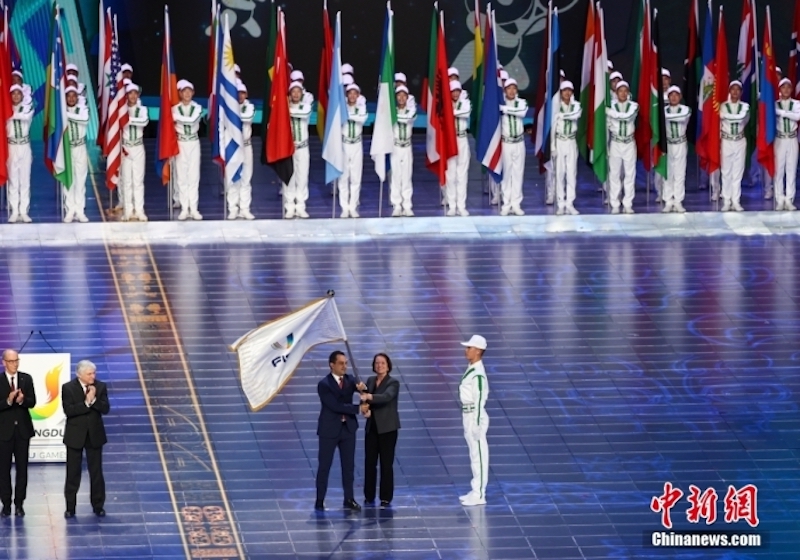 A bandeira da FISU foi entregue pelo mergulhador campe?o mundial nativo de Sichuan, Gao Min, e o primeiro medalhista de ouro chinês na Universíade de Chengdu, Cao Maoyuan, a Eder e ao secretário-geral e CEO da FISU, Eric Saintrond, que a transmitiram a Mahmut Ozdemir, membro do Bundestag alem?o e representante das próximas cidades-sede do Reno-Ruhr.