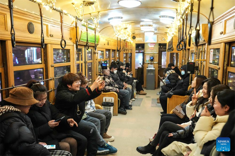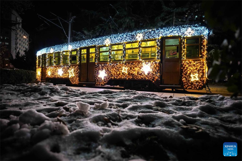 Um elétrico decorado com luzes é visto em Dalian, província de Liaoning, nordeste da China, em 9 de janeiro de 2024. Desde 31 de dezembro de 2023, vários elétricos em Dalian foram decorados com luzes para atrair mais turistas. A história do elétrico na cidade de Dalian remonta a 1909. Após mais de 100 anos de opera??o, o elétrico se tornou um ícone popular da cidade. Como a indústria do turismo em Dalian se recuperou desde 2023, muitos turistas vêm pegar os elétricos para apreciar a paisagem urbana. (Xinhua/Pan Yulong)