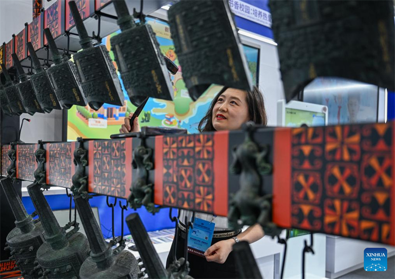 Conjunto de instrumentos de percuss?o tradicionais chineses, na Exposi??o de Conquistas da Educa??o Digital da Conferência Mundial de Educa??o Digital 2025.