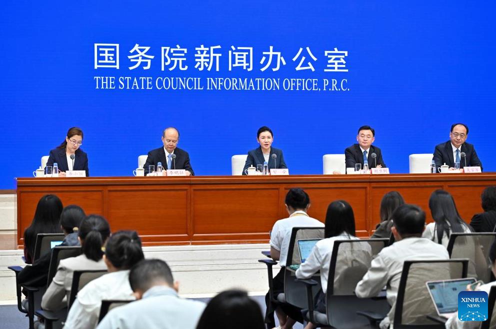O Ministro da Justi?a da China, He Rong, e os vice-ministros da Justi?a, Hu Weilie, Li Mingzheng e Wu Yanjun, participam de uma coletiva de imprensa realizada pelo Gabinete de Informa??o do Conselho de Estado (SCIO) sobre a promo??o do Estado de Direito socialista e da administra??o judicial. (Li Xin/Xinhua)
