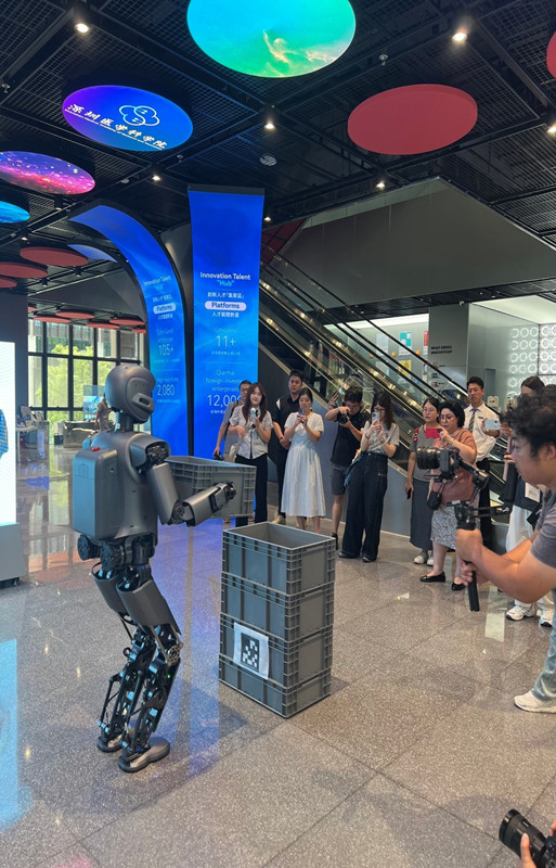 Repórteres observam um rob? humanoide carregando uma caixa em uma empresa no Centro de Inova??o e Empreendedorismo Juvenil de Qianhai Shenzhen-Hong Kong, a 15 de setembro de 2025.