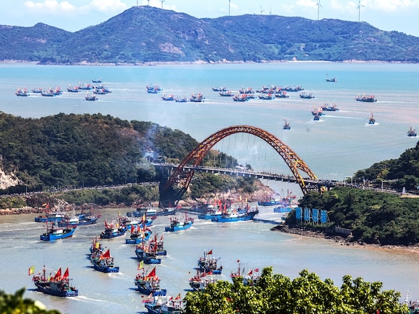 No Porto de Shipu, no condado de Xiangshan, em Ningbo, província de Zhejiang, mais de 1.000 embarca??es se alinharam e partiram para águas abertas ao meio-dia, com os motores rugindo e as velas pontilhando o horizonte, criando um cenário espetacular.