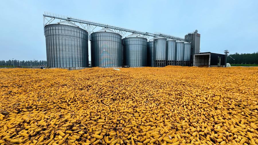 Instala??es de secagem para milho na cidade de Dezhou, província de Shandong, no leste da China, em 9 de outubro de 2025. (Foto de Zhao Huhao/Xinhua)