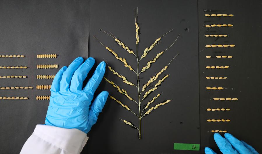 Um técnico observa as características de sementes de arroz em um laboratório da Universidade Agrícola de Shenyang, na província de Liaoning, nordeste da China, em 28 de abril de 2024. (Yang Qing/Xinhua)