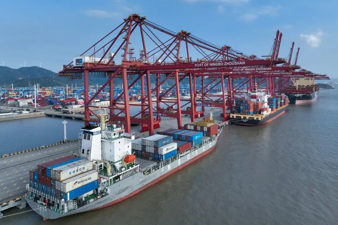 Opera??es de carga e descarga de contêineres no Terminal Dapukou do Porto de Zhoushan, em Ningbo. (Zou Xunyong/Xinhua)