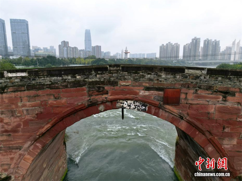 Vista aérea da Ponte Antiga do Templo Erjiang, em Chengdu, província de Sichuan, mostra uma espada de ferro pendurada em seu arco central sobre o Rio Jinjiang, criando o espetáculo da "Espada Pendurada na Ponte Antiga", em 31 de outubro de 2025.