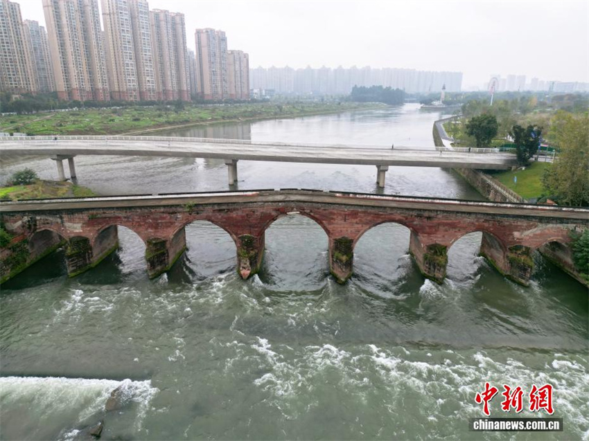 Vista aérea da Ponte Antiga do Templo Erjiang, em Chengdu, província de Sichuan, mostra uma espada de ferro pendurada em seu arco central sobre o Rio Jinjiang, criando o espetáculo da "Espada Pendurada na Ponte Antiga", em 31 de outubro de 2025.