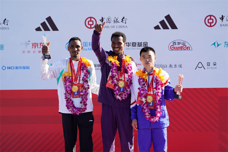 Lemi Berhanu Hayle (C), da Etiópia, primeiro colocado, posa com Desalegn Girma Debel (E), também da Etiópia, segundo colocado, e Han Il Ryong, da República Popular Democrática da Coreia (RPDC), terceiro colocado, durante a cerim?nia de premia??o da maratona masculina da Maratona de Beijing 2025, em Beijing, em 2 de novembro de 2025. [Foto/Xinhua]
