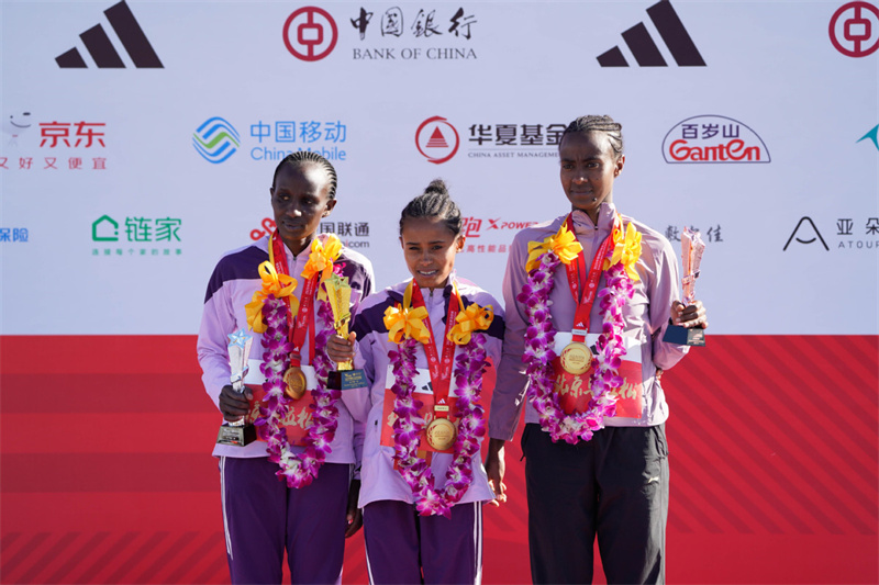 A primeira colocada, Anchinalu Dessie Genaneh (C), da Etiópia, posa com a segunda colocada Marion Jepkonga Kibor (L), do Quênia, e a terceira colocada Kuftu Tahir Dadiso, da Etiópia durante a cerim?nia de premia??o da maratona feminina na Maratona de Beijing 2025, 2 de novembro de 2025. [Foto/Xinhua]