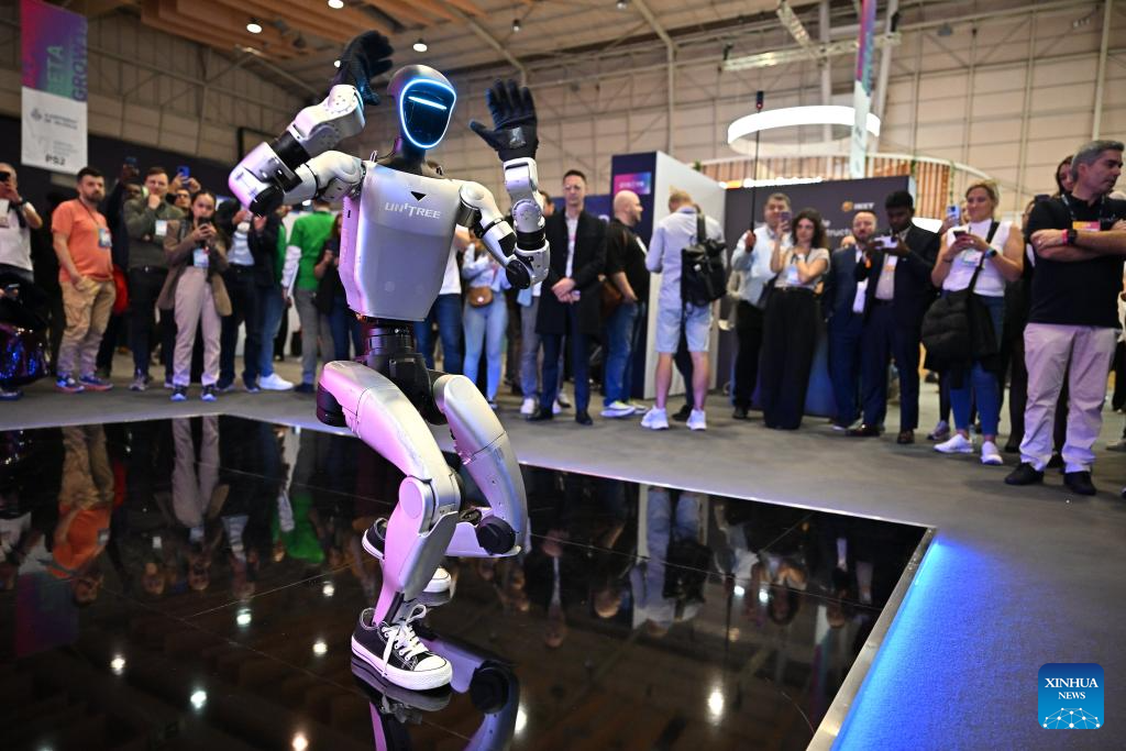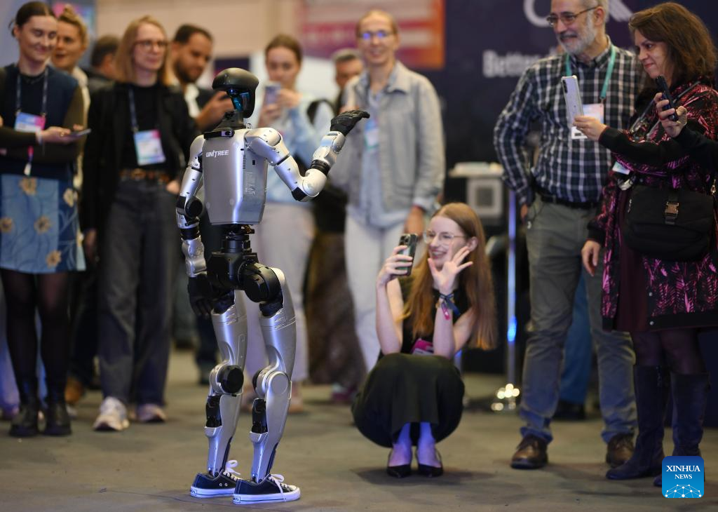 Um rob? da Unitree Robotics interage com os participantes da Web Summit em Lisboa, Portugal, em 12 de novembro de 2025. (Foto: Xinhua)