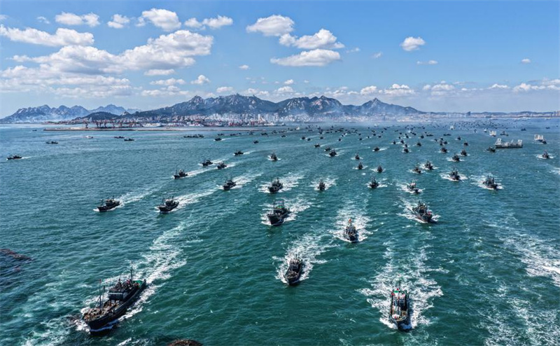 Vista aérea de barcos de pesca partindo após o fim da moratória da pesca nos mares Amarelo e Bohai, no porto de pesca de Shidao, na cidade de Rongcheng, província de Shandong, leste da China, em 1o de setembro de 2025. (Foto: Li Xinjun/Xinhua)