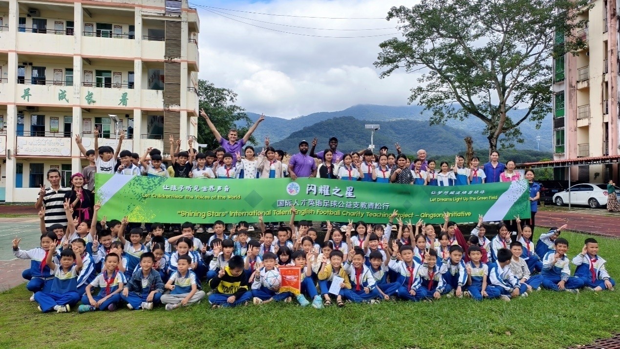 Membros da Comunidade Internacional de Talentos de Haikou e da Equipe de Voluntários Internacionais de Talentos de Haikou realizam um programa de ensino de inglês e um programa de treinamento de futebol para alunos locais na vila de Qingsong, Condado Aut?nomo da Etnia Li de Baisha, província de Hainan, sul da China, em outubro de 2025. (Foto fornecida pela Comunidade Internacional de Talentos de Haikou)