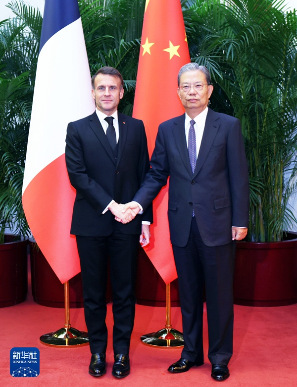 Zhao Leji, presidente do Comitê Permanente da Assembleia Popular Nacional (APN), reuniu-se com o presidente francês Emmanuel Macron em Beijing na quinta-feira.